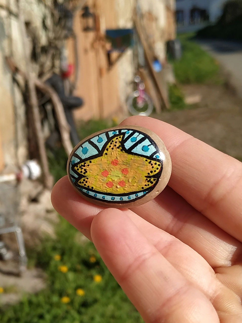 Je peins sur des supports naturels – galets ou ardoises – choisis avec soin, et je laisse l’inspiration me traverser : un animal de pouvoir, une étoile, une fleur, un symbole.